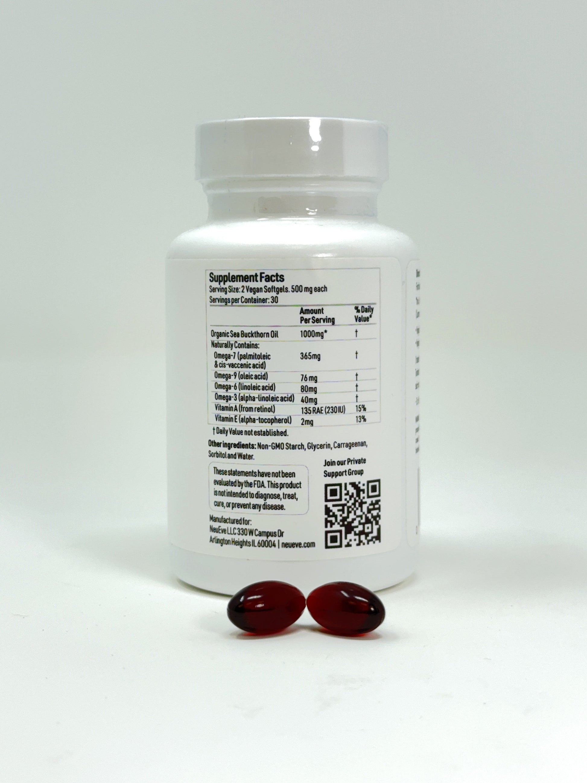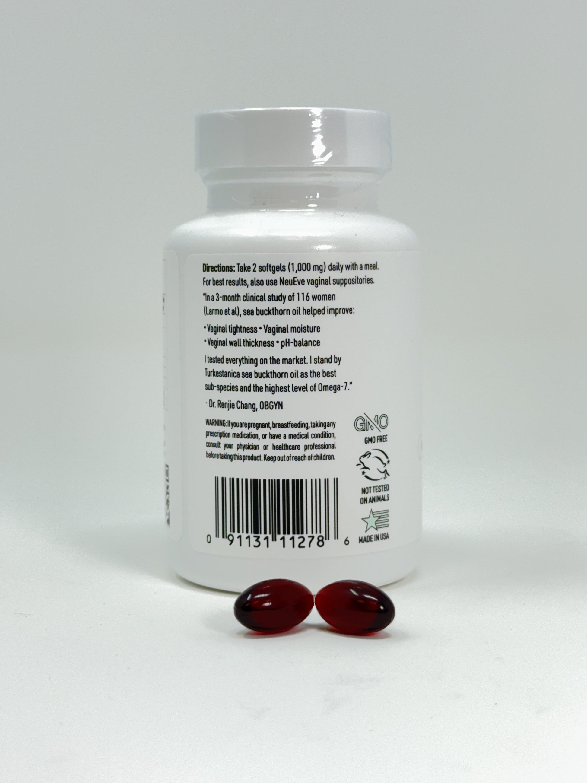 Read a scientific study of the effects of sea buckthorn oil on vaginal dryness for 116 menopausal women. There was a significantly better rate of improvement in the integrity of vaginal epithelium when using sea buckthorn oil. If your dryness is severe, to achieve optimal result, it is recommended that you use it in combination with NeuEve Gold suppositories (age<45), Silver (45-55), Silk (55-70), or Sensitive Silk (>70) and NeuEve vulva balm (<70) or Sensitive vulva balm (>70).